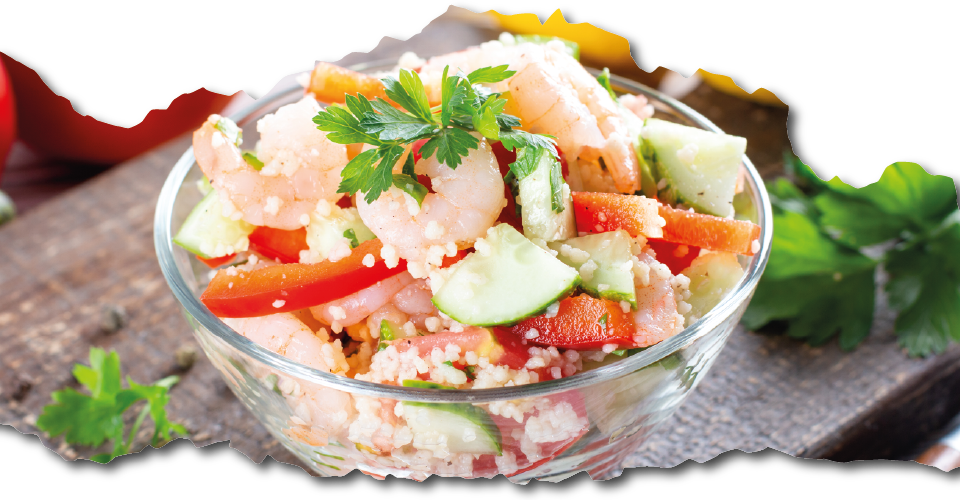 - Ajouter les crevettes et les pousses de salade. Servir bien frais.
